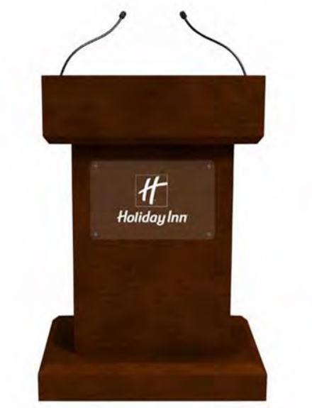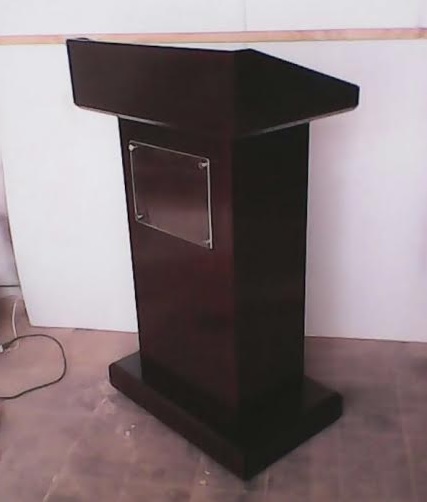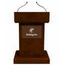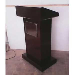 Podium con gran presencia, fabricado en maderas finas, repisas internas, especial para hoteles, centros de convenciones, incluye acrilico frontal de 25 cm de altura x 40 cm con chapetones metalicos.