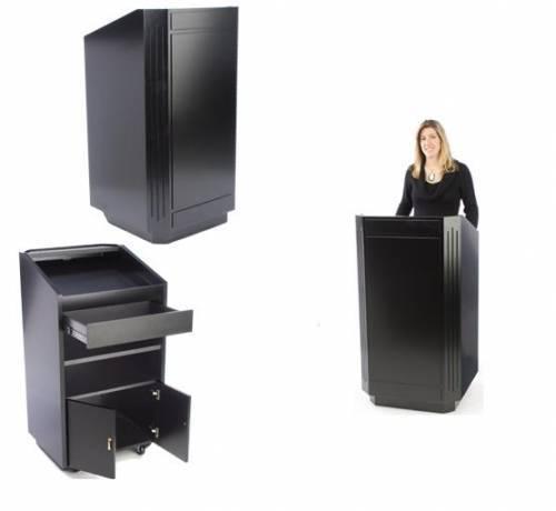 Este podium estilo púlpito especial para muebles de la iglesia, o de pie la presentación tiene una plataforma en el medio que se puede quitar para tener hasta 14 "de espacio por encima del gabinete, y por debajo del cajón. La gran superficie de lectura en esta tribuna negro tiene un montón de maestros espacio para la encuadernación de 3 anillos, un bloc de notas y hasta un ordenador portátil. También hay un 1-1/2 "de labios en la superficie de lectura para asegurar los suministros de la presentación no se deslice. Este púlpito de la iglesia, como anfitriona restaurante de pie, o maestros podio ha puertos de cable en todas partes, de arriba a abajo, de modo que puede correr un cable de alimentación a su computadora portátil y no dejar los cables expuestos. La superficie superior también cuenta con 2 puertos agujeros para, posiblemente, un micrófono para ser añadido y conectar fácilmente y aún mantener su podio en busca limpio y organizado.