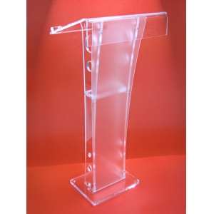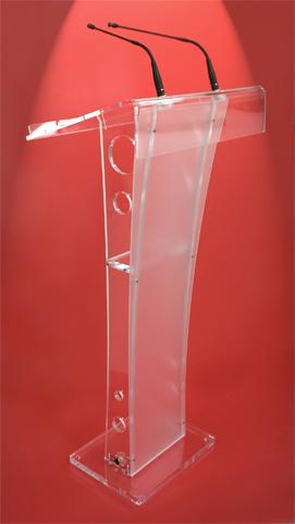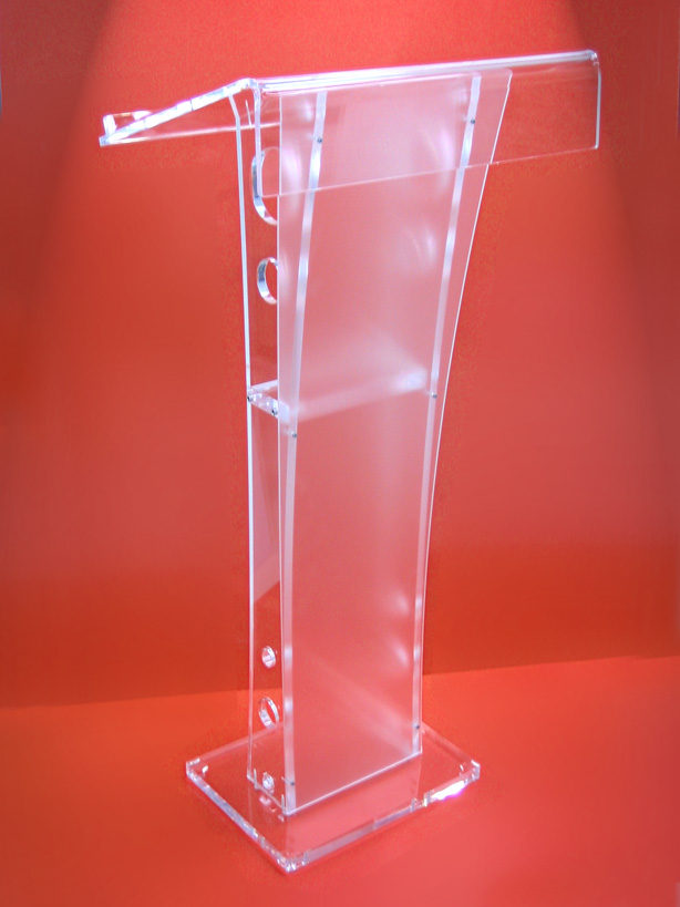 Podium Europa de orador fabricado en acrilico 12 y 6 mm transparente de alta calidad. Frontal en acrilico blanco satinado con amplia superficie para personalizar. La mesa del atril tiene capacidad para una computadora portatil. Diseño cuidado para una máxima funcionalidad. Equilibrio entre imagen y ergonomía. Medidoa 1.20 m de altura, 60 cm x 45 cm profundidad paleta de documentos